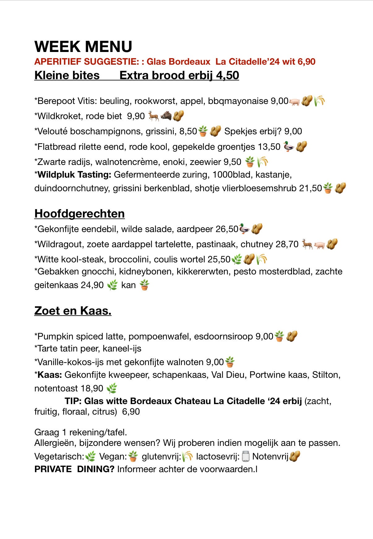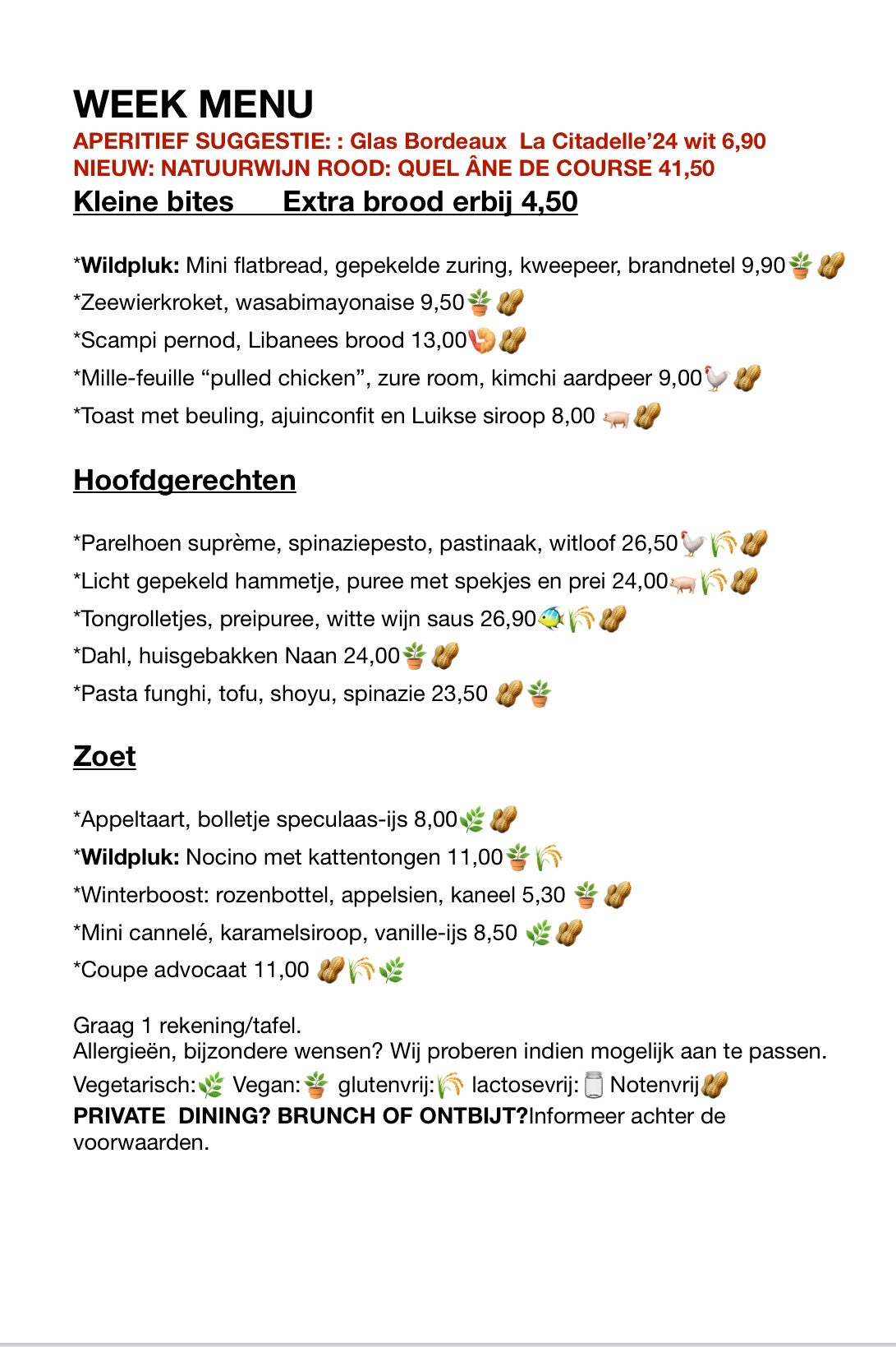 We bieden een seizoensgebonden keuken aan! Suggesties wisselen wekelijks omdat we graag inspelen op wat er dagelijks voorhanden is!